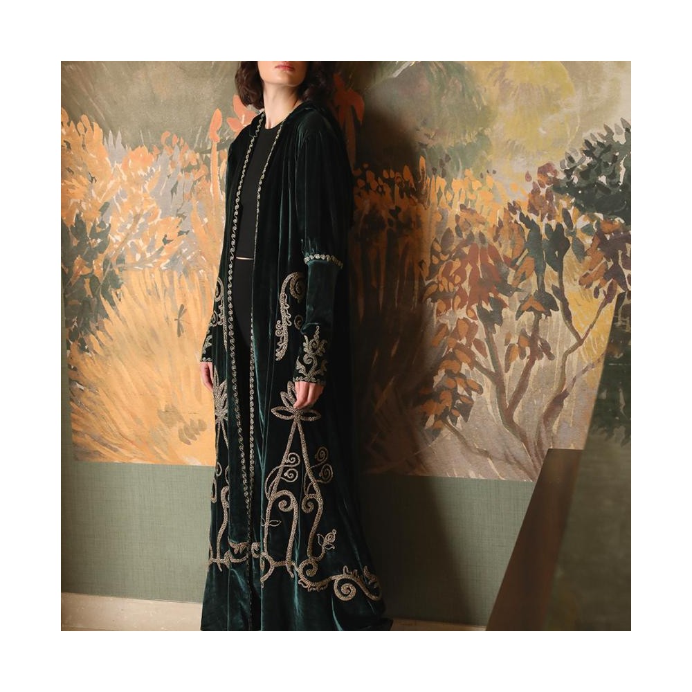 Crafted from plush velvet fabric, this abaya showcases refined embroidery and long sleeves for a graceful and elegant appearance.