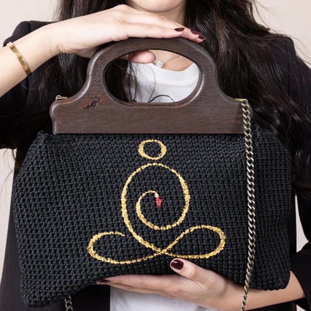 A customizable handcrafted crochet bag with a wooden handle and elegant metallic chain.