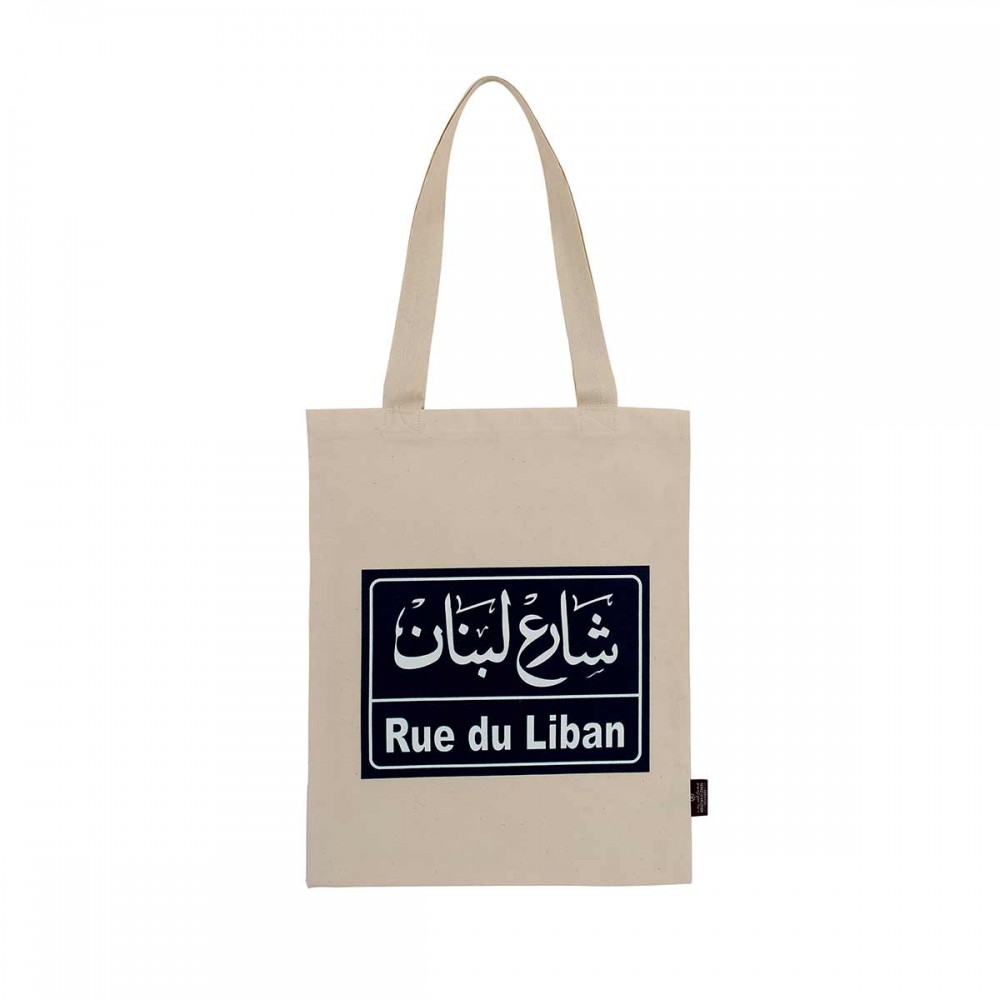 A beige canvas tote bag featuring "Rue Du Liban" printed in white and black, with shoulder straps.