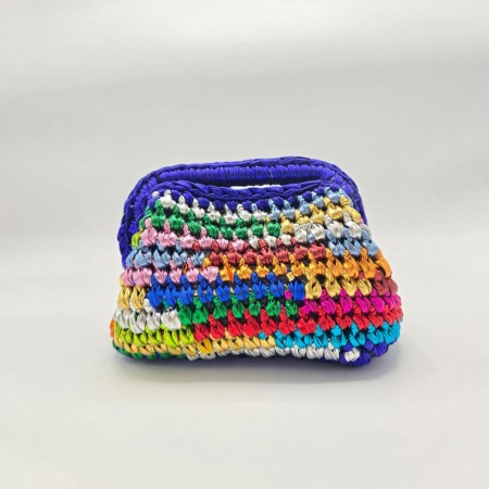 A multicolor handwoven clutch crafted from metallic leather threads in lively, eye-catching tones.