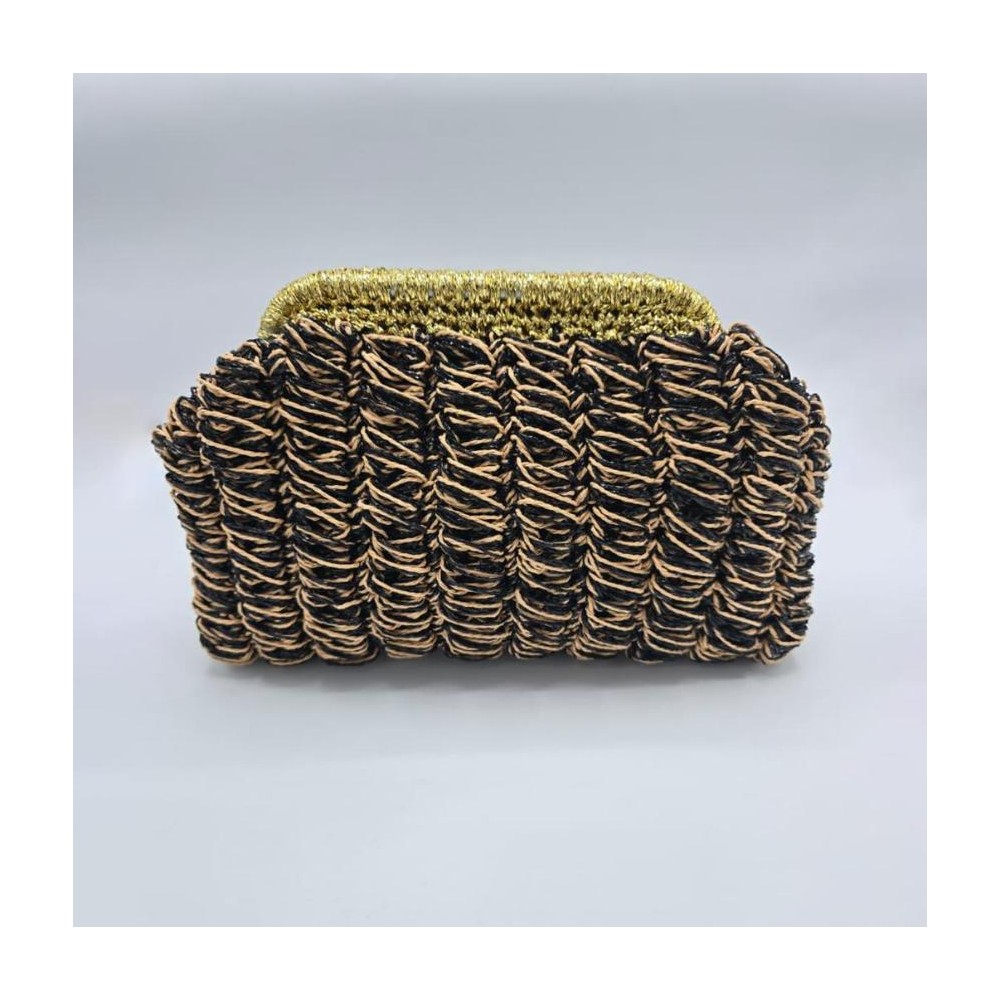 A raffia clutch woven in black and gold tones with a polished sculpted shape.