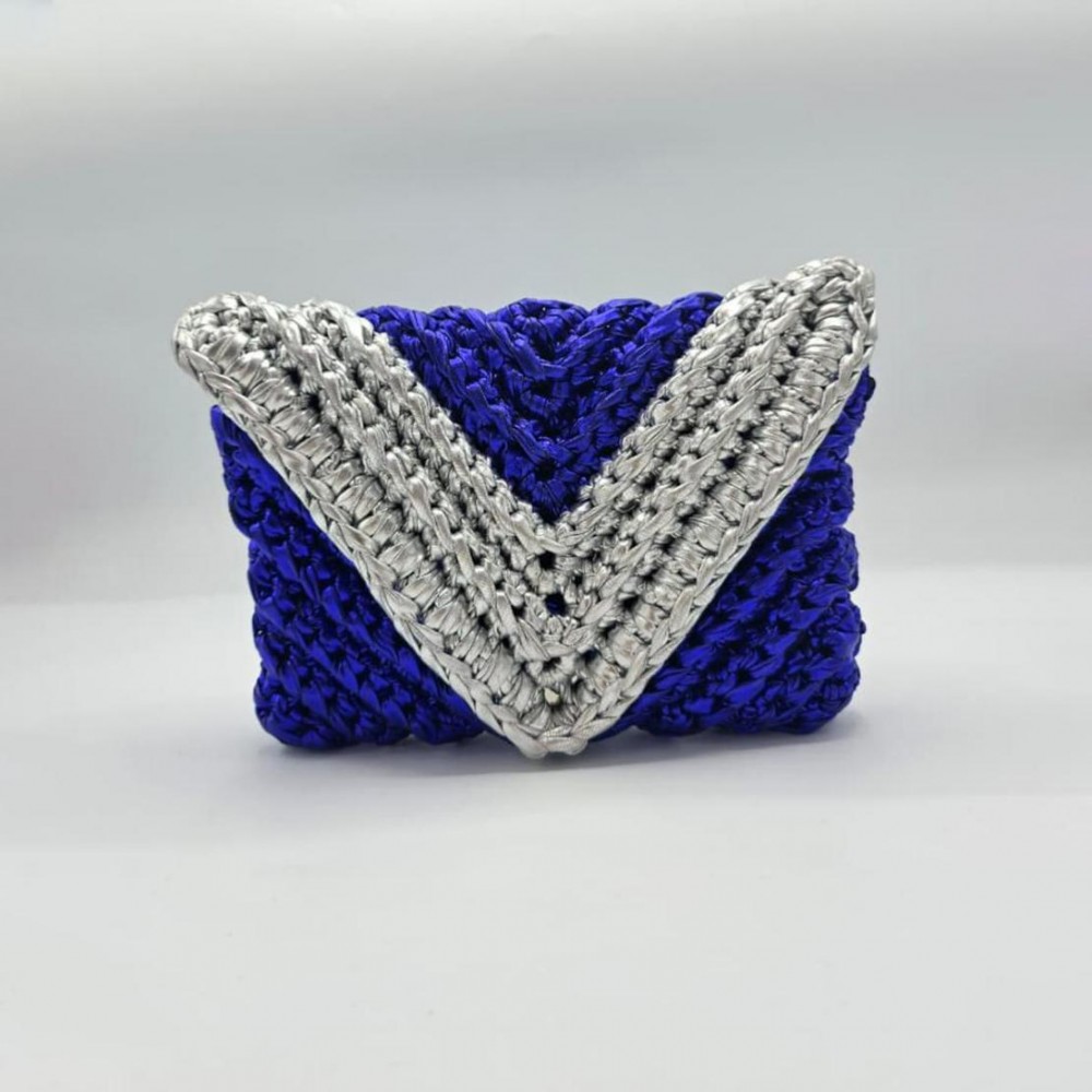 A handwoven clutch in royal blue and silver metallic threads with a structured envelope shape.