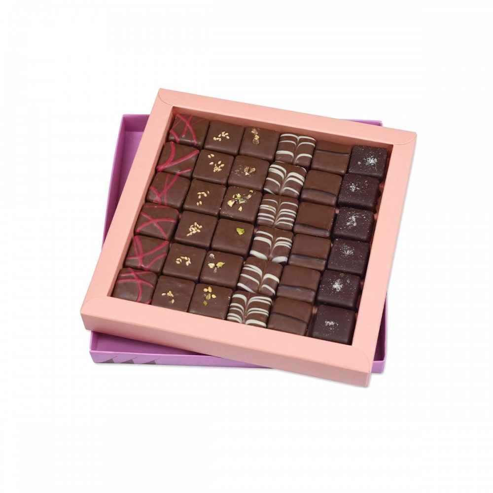 An assorted selection of 36 finely crafted chocolates showcasing varied textures and premium ingredients.