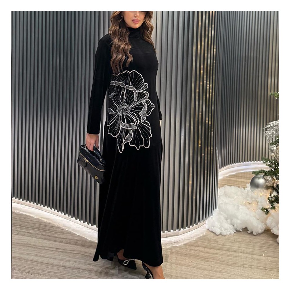 A velvet dress featuring silver floral detailing, designed for an elegant evening silhouette.