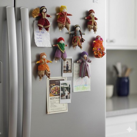 A handcrafted decorative magnet doll inspired by Lebanese folklore and cultural heritage, highlighted by rich ruby red and gold accents, bold and timeless.