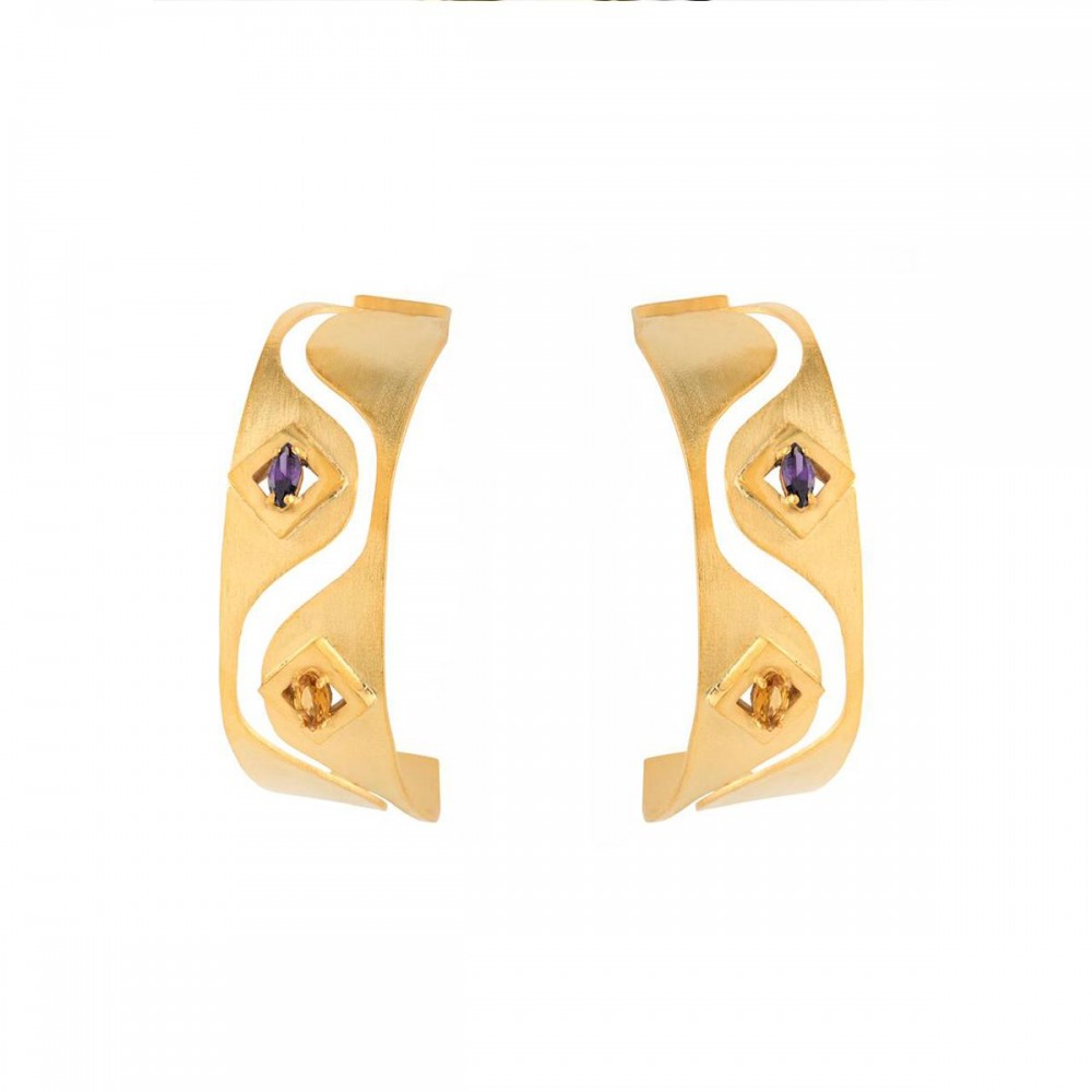 Gold-plated brass hoop earrings with wavy design and subtle gemstone accents for a modern twist.