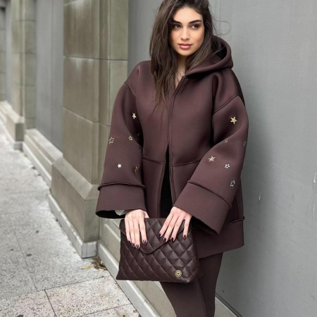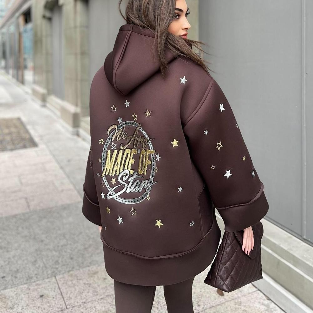 A rich chocolate brown jacket made from smooth, stretchy scuba fabric, featuring 'We Are Made of Stars' embroidery and scattered stars across the back and sleeves.
