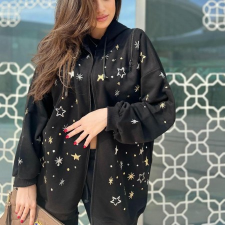 A black hooded jacket crafted from soft French terry fabric, embroidered with the word “Lebanon” and scattered stars.