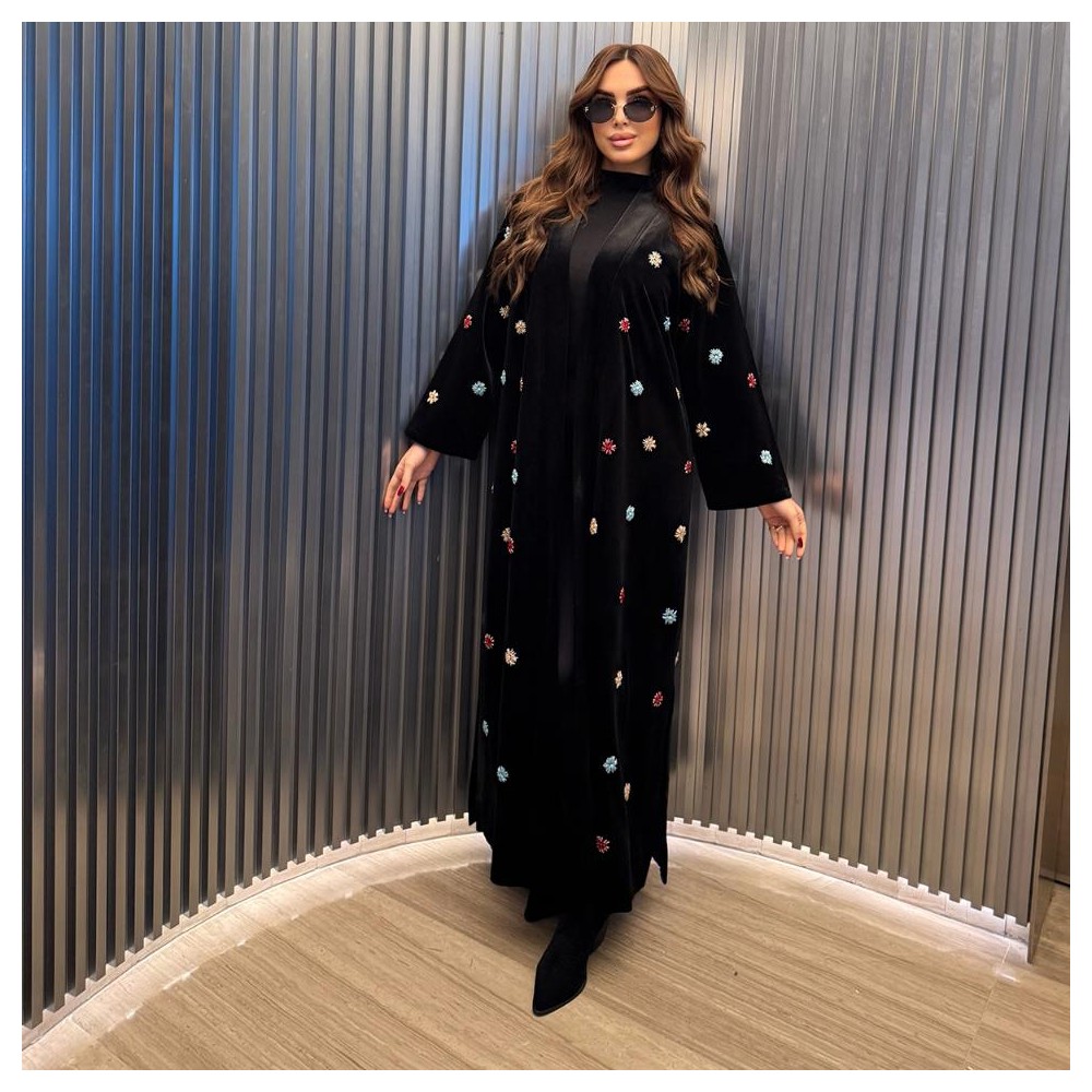 A black velvet kaftan adorned with multicolored floral embellishments, fully lined for enhanced comfort and structure.