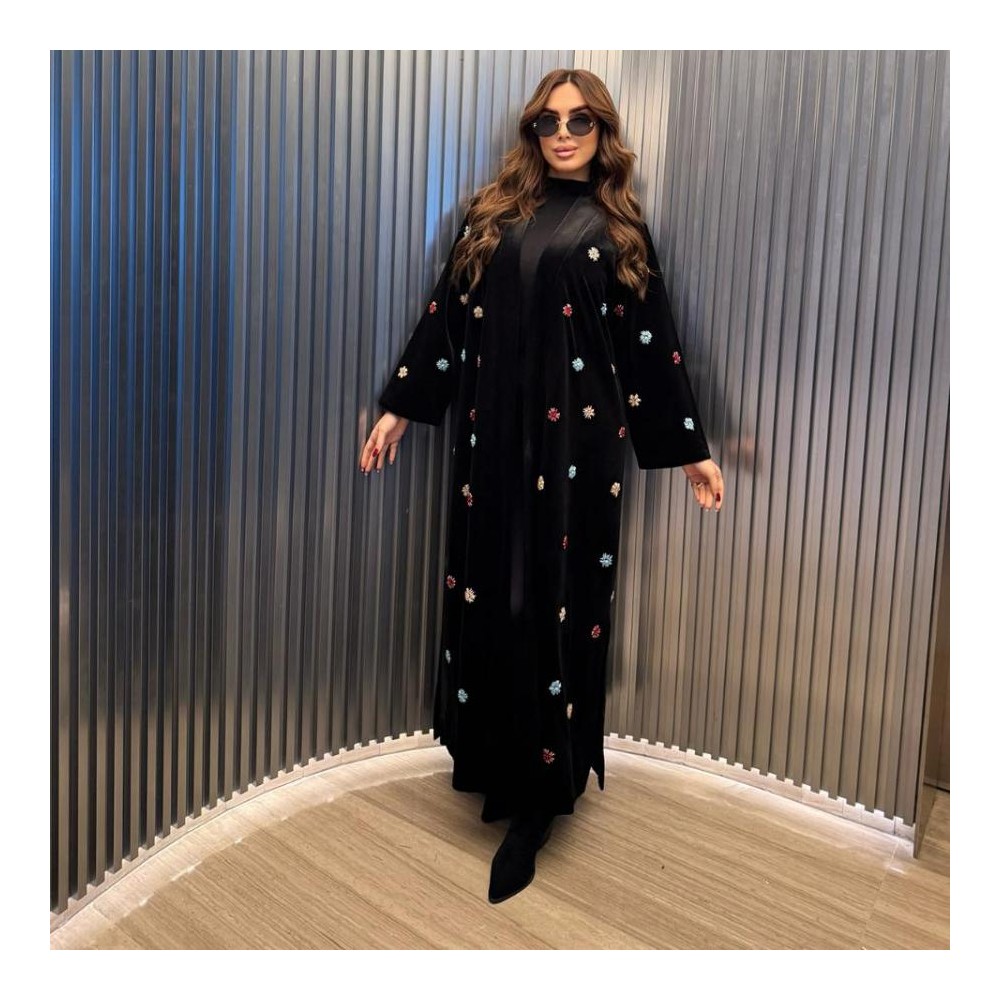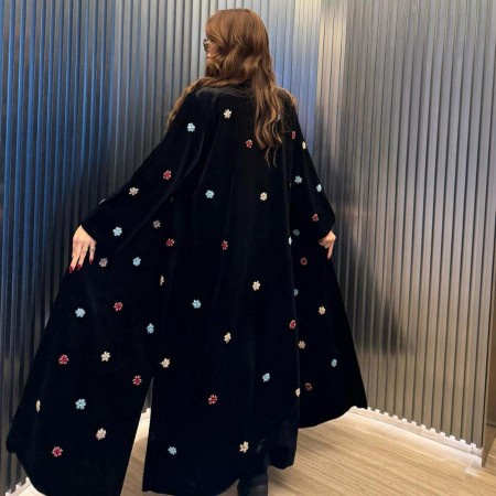 A black velvet kaftan featuring multicolor rose embroidery, fully lined for comfort and structure.