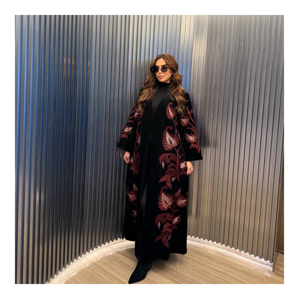 A velvet kaftan featuring orchid-inspired embroidery, fully lined for comfort and structure.