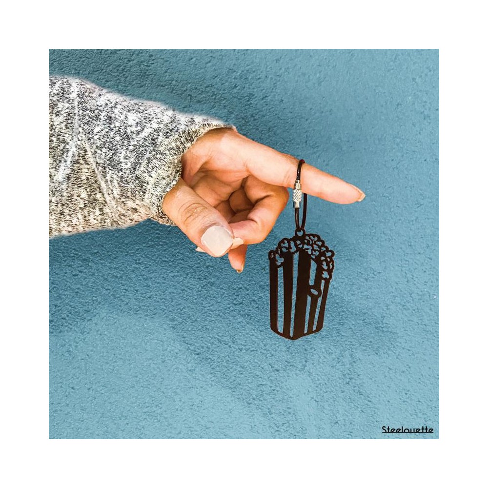 A popcorn keychain crafted from steel and coated in black.