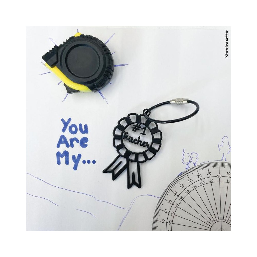 A steel keychain featuring the phrase "#1 Teacher", coated in black.