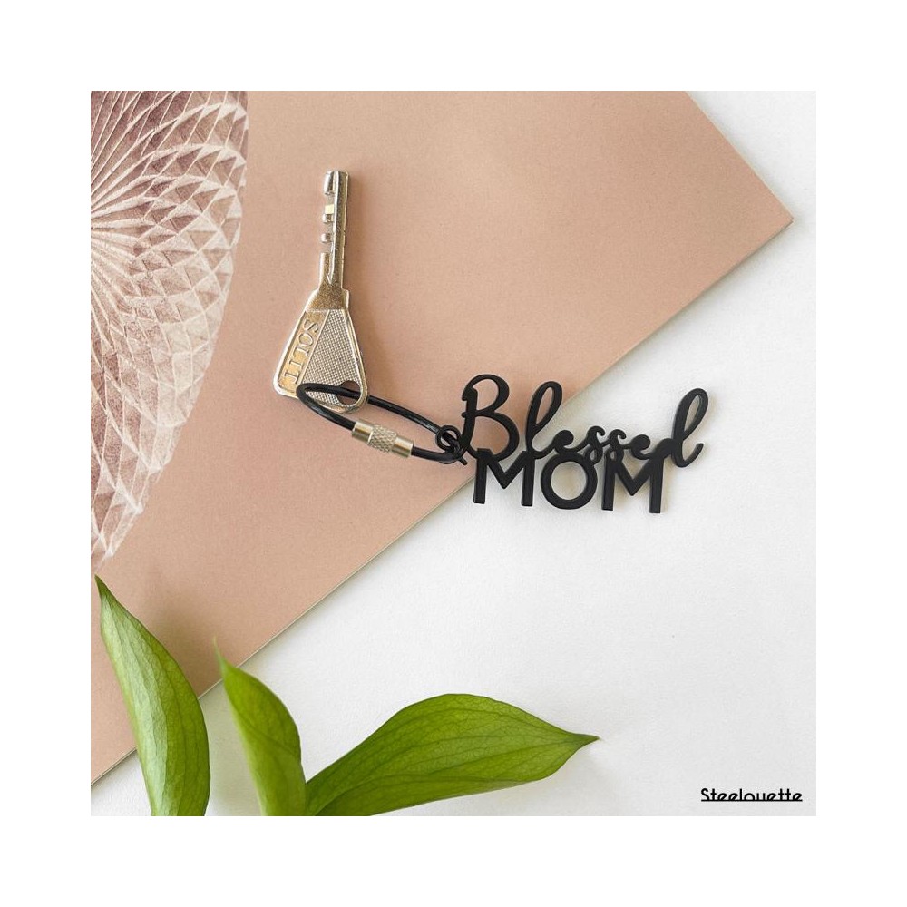 A steel keychain featuring the words "Blessed Mom", coated in black.