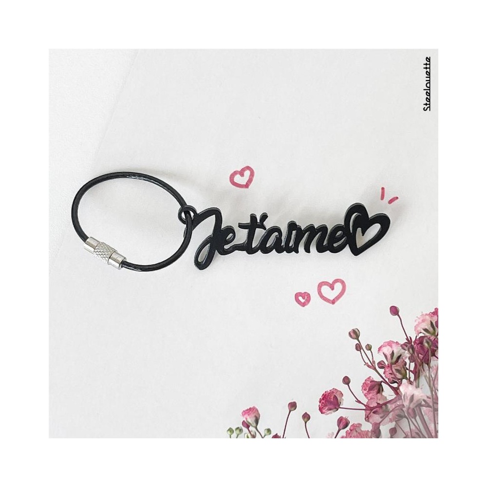 A steel keychain featuring the words "Je T'aime" in French, coated in black.