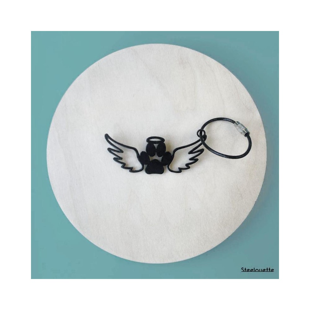 An 'Angel Paws' keychain crafted from steel, featuring a paw with angel wings, and coated in black.