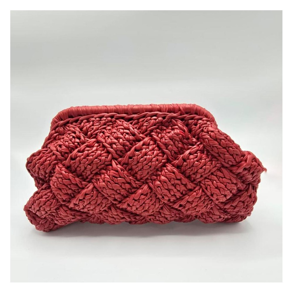 A matte red metallic clutch with a clean woven texture and modern structure.