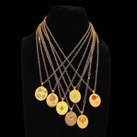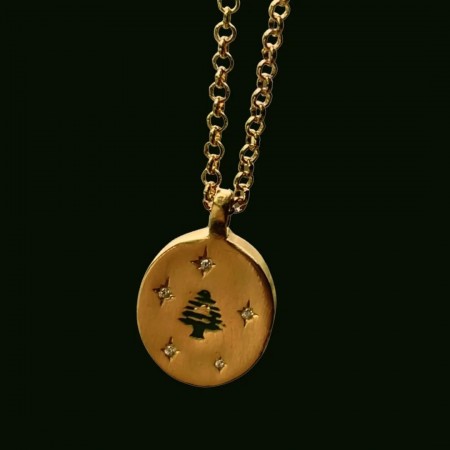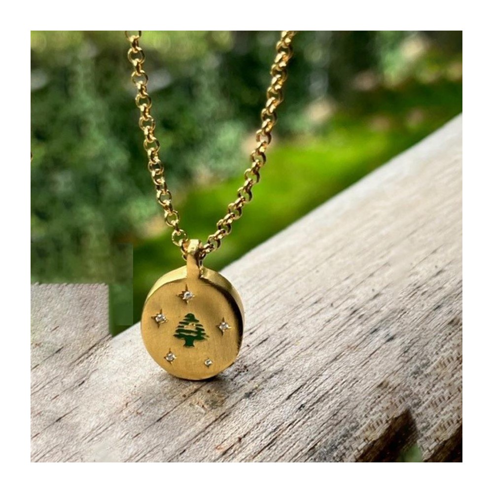 Gold-plated brass necklace with a round pendant featuring a green cedar tree and star crystal detailing.