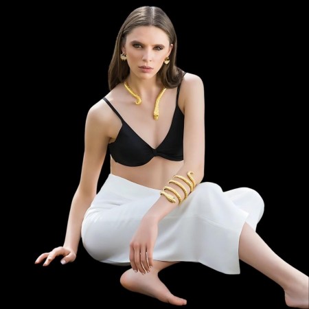 Gold-plated brass necklace shaped as a coiled snake, elegantly wrapping around the neck with engraved details.