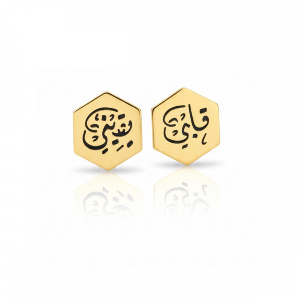 Bold hexagonal 18k gold-plated brass "قلبي يقيني" — “My heart is my certainty.”
