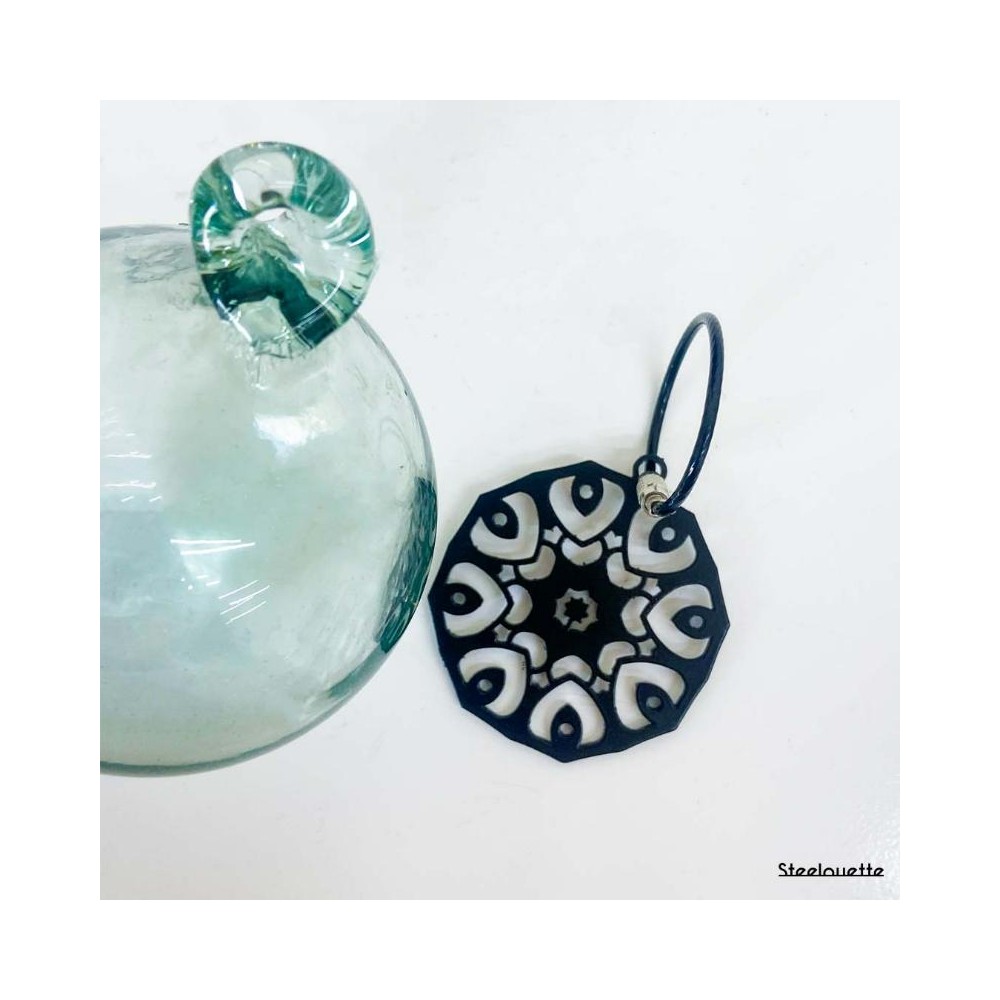 A mandala-shaped keychain crafted from steel, featuring a geometric design and coated in black.
