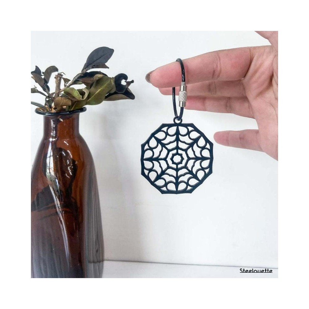 A mandala-shaped keychain crafted from steel, featuring a geometric design and coated in black.
