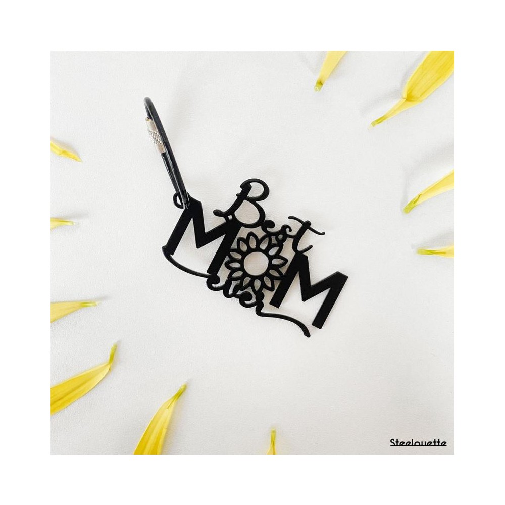A steel keychain featuring the words "Best Mom", coated in black.