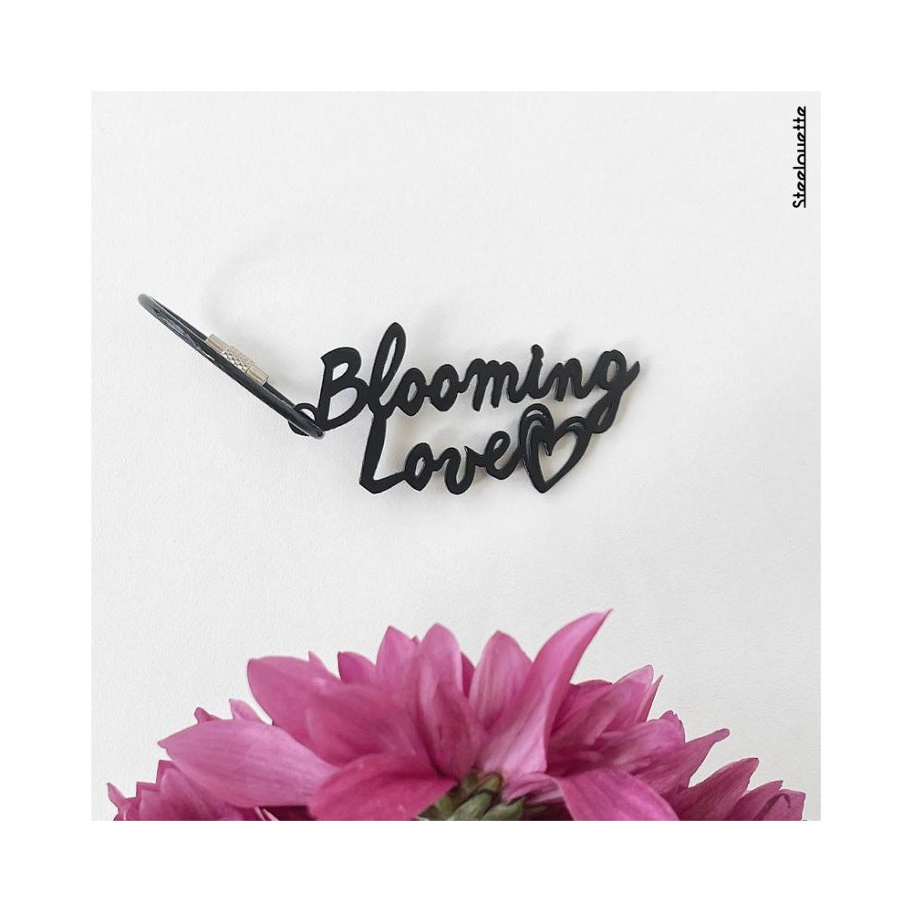 A steel keychain featuring the words "Blooming Love", coated in black.