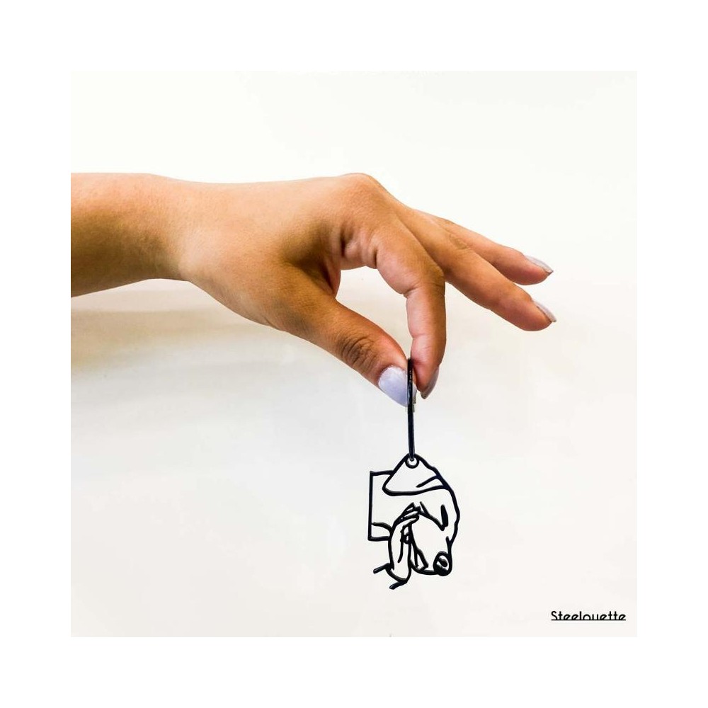 A steel keychain featuring a hand petting a dog, coated in black.