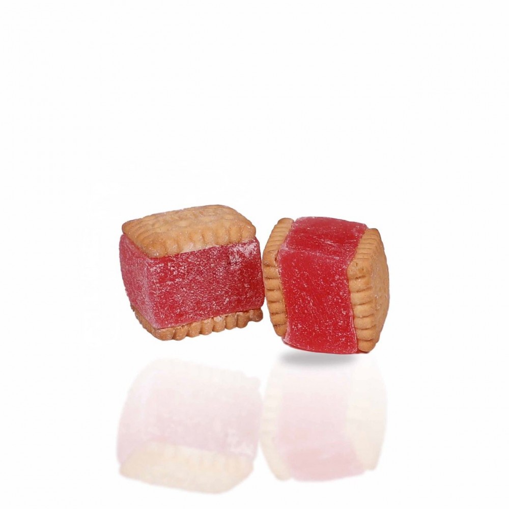 Ingredients: Sugar, glucose, corn starch, wheat flour, cow's butter, fructose, whey components, salt, raising agent (sodium bicarbonate), food colors (FD&C RED #40), skimmed cow milk, acidic regulator (citric acid), flavorings (vanilla, blossom water), pasteurized egg.