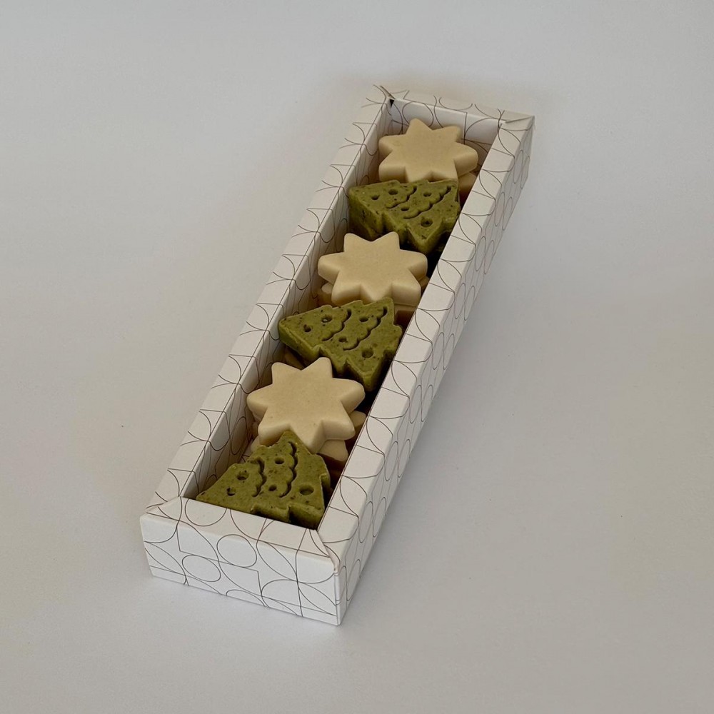 An elevated sugar-free assortment of 18 marzipan Christmas shapes, naturally flavored with pistachio.