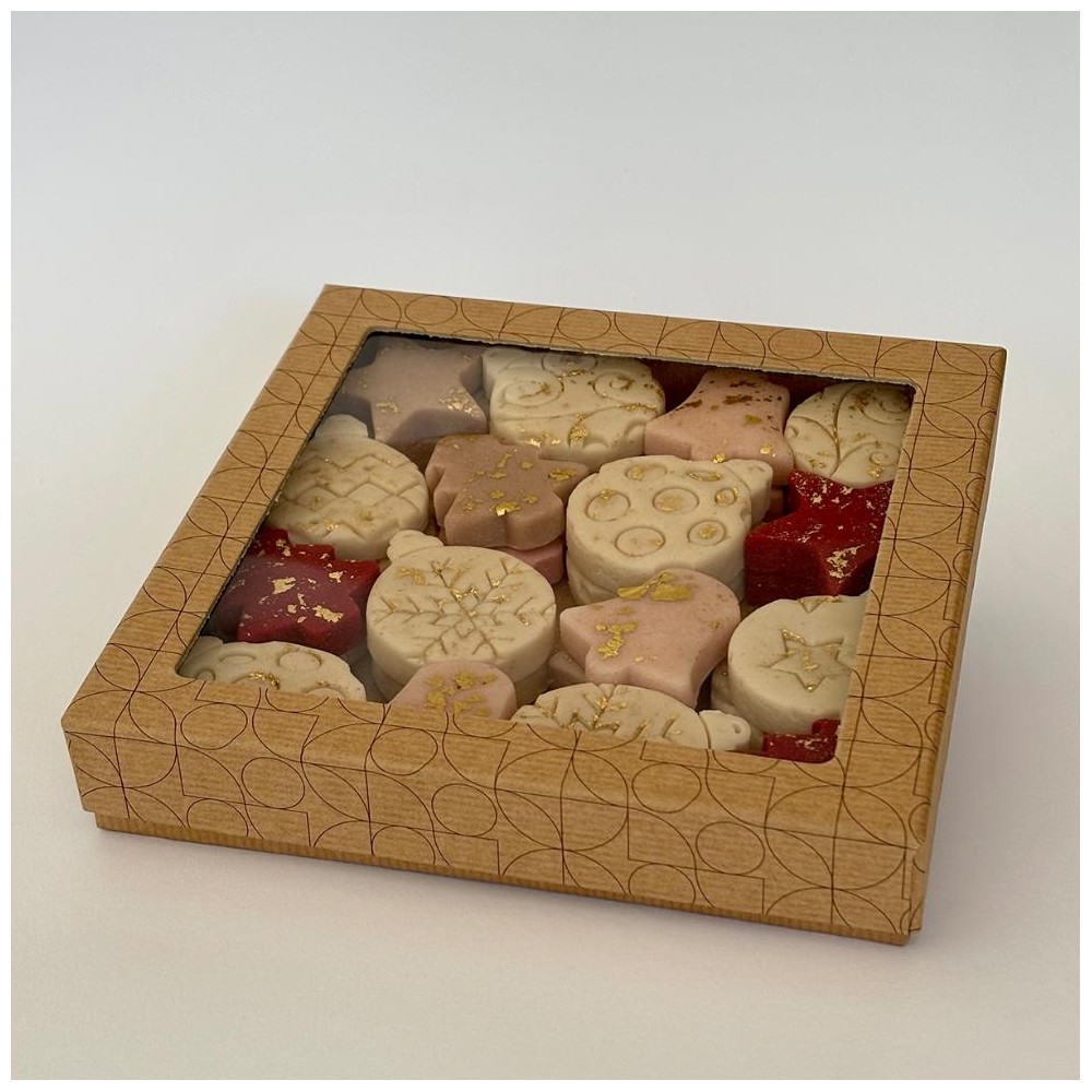 A generous 500g celebration of artisanal marzipan Christmas shapes in refined festive colors.