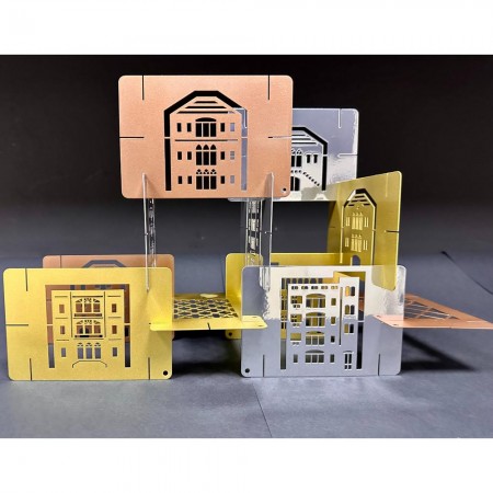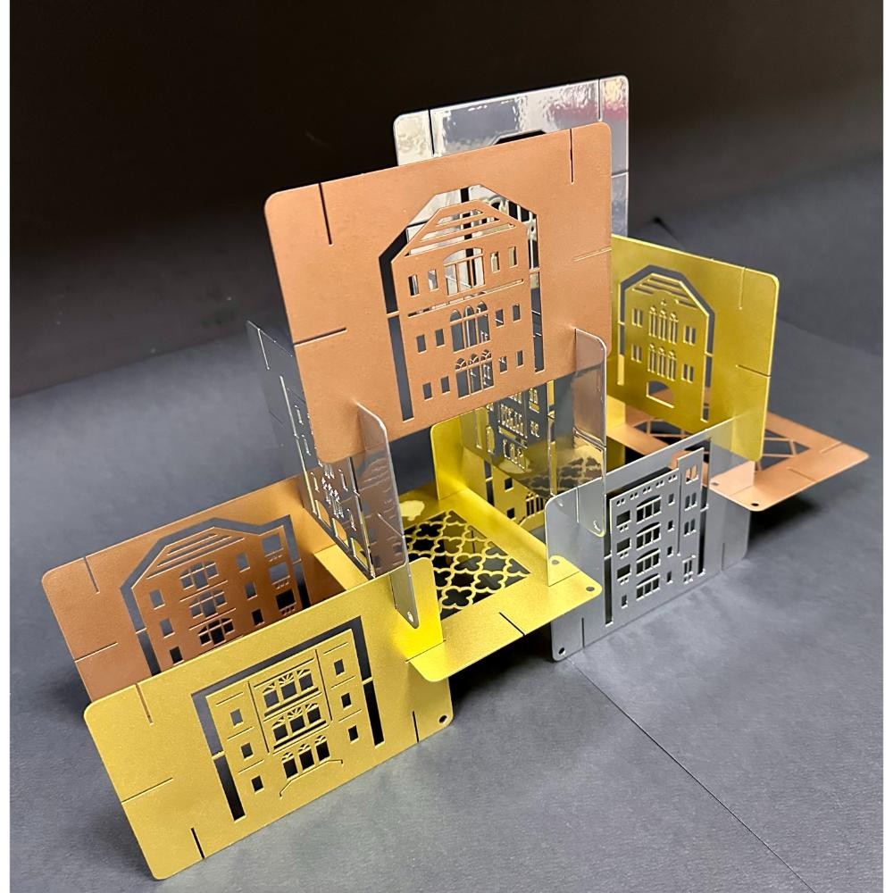 Material: Powder-coated metal in copper, silver, and gold