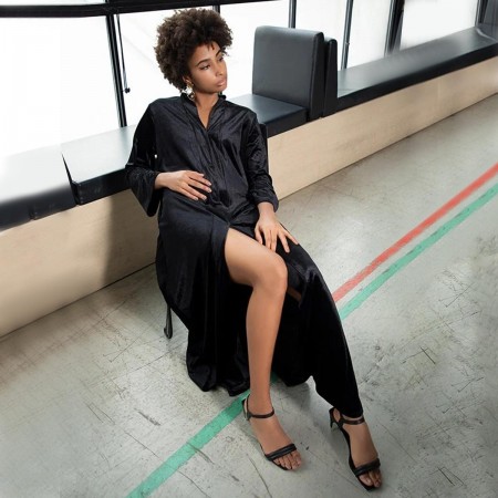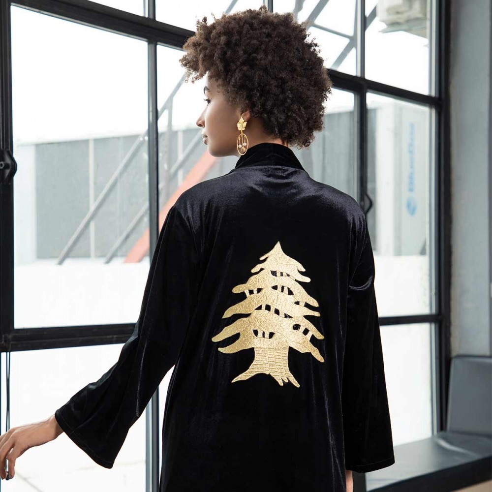A black velvet abaya featuring a Cedar tree embroidery in gold, with long sleeves. One size fits all.