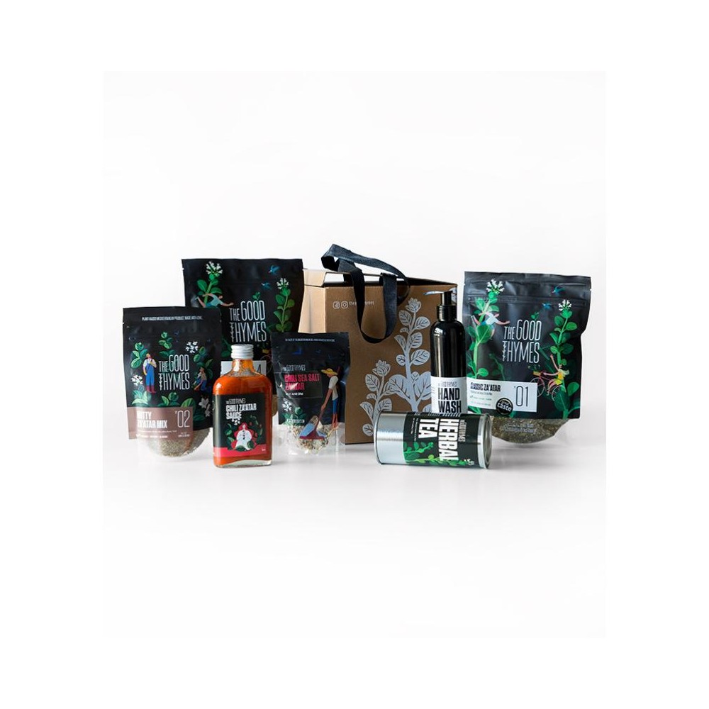 This spicy selection box includes: Classic zaatar mix bag (350g), Nutty zaatar mix bag (120g), Hot zaatar mix bag (350g), Chili sea salt zaatar bag (125g), Chili zaatar sauce bottle (200ml), Herbal tea tin (70g), The Good Thymes hand wash.